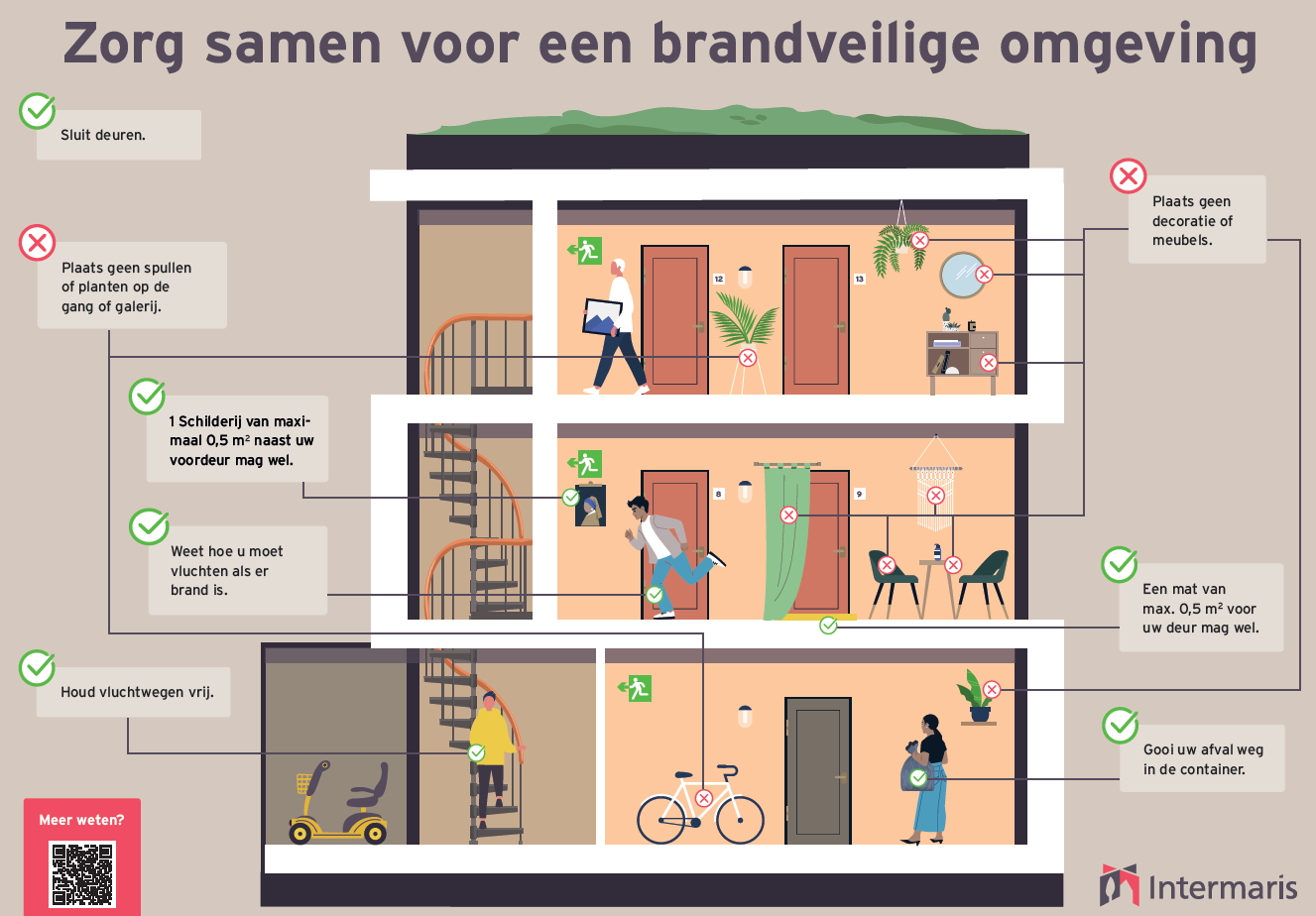 Er mogen geen brandbare spullen in de algemene gangen, op de galerijen en in de algemene ruimtes staan