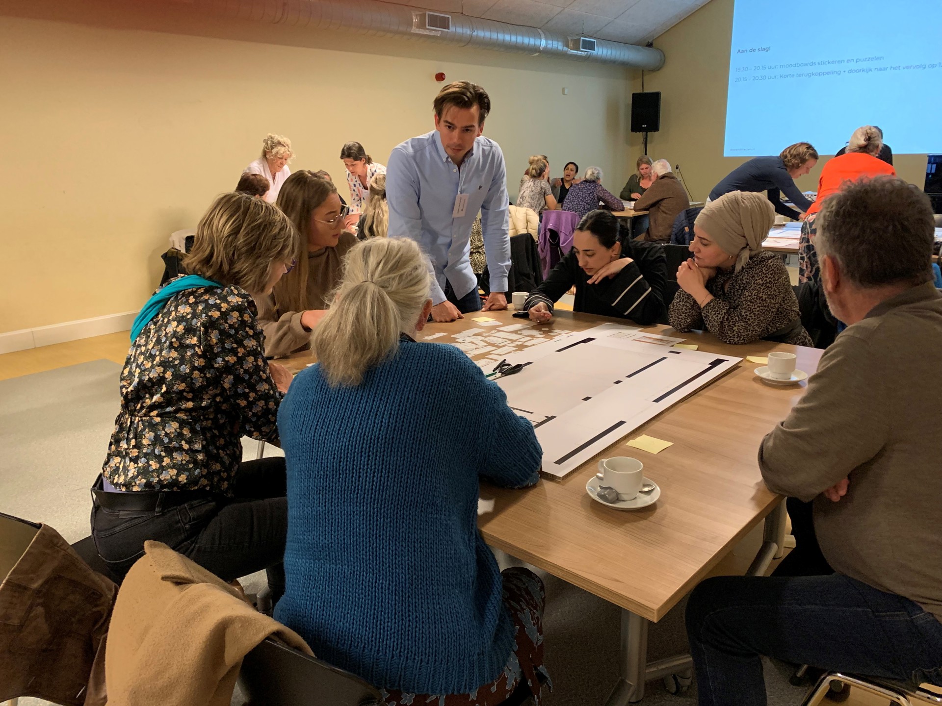 Na de presentatie gingen de aanwezigen in groepjes aan de slag met moodboards. Ze plakten stickers op de borden met de sfeer en kleuren, die hen het meeste aanspreken. En met elkaar gaven ze de gemeenschappelijke ruimten vorm. Er werd hevig gediscussieerd of er sporttoestellen moesten komen of een speelhoek voor kinderen. Of allebei. De meesten zagen een keukenblok en lange tafel ook wel zitten. Samen koken en eten, dat verbindt. Gelukkig is er ruimte genoeg. Een paar weken terug rondde men de workshops over de gemeenschappelijke binnentuin en dakterrassen af. Centraal daarbij stond dat het een prettig verblijfsgebied moet zijn, waterrobuust, hitte- en droogtebestendig en biodivers. Ook hier staan gezamenlijk koken (bbq) en ontmoeten centraal.