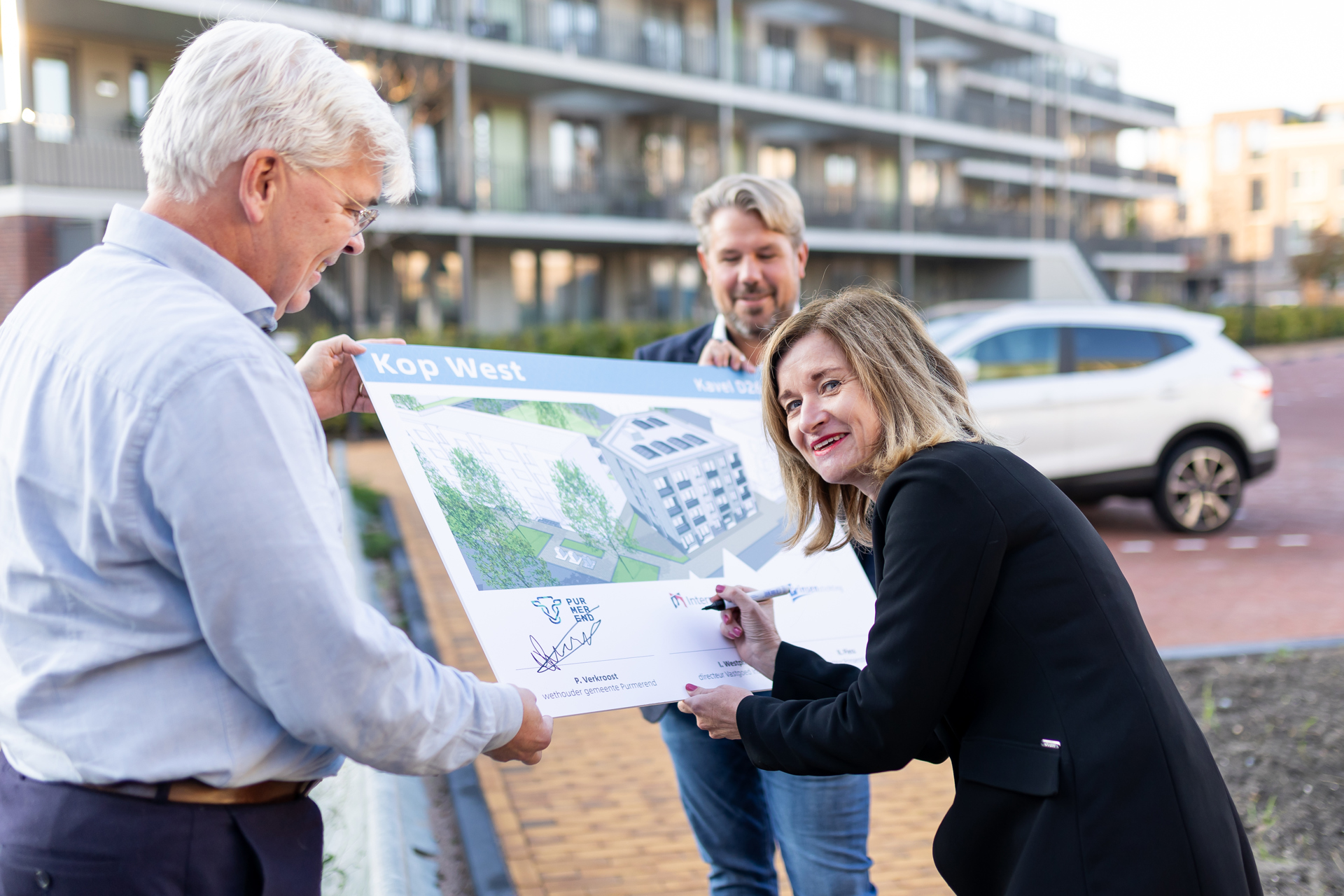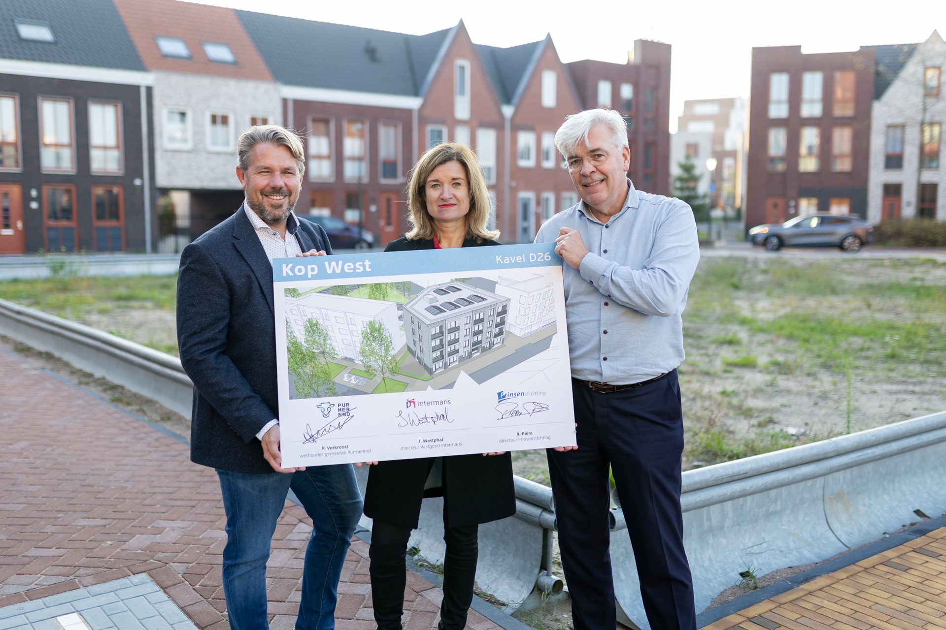 Met drie ferme handtekeningen tekenden de gemeente Purmerend, Intermaris en Prinsenstichting afgelopen donderdag voor de komst van een nieuw woongebouw aan de Pleinbuurt in Kop West. Woningcorporatie Intermaris wil op deze locatie 18 sociale woon- en zorgappartementen en 4 flex-kamers bouwen voor Prinsenstichting. Daarvoor sloot Intermaris al eerder deze maand een koop- en realisatieovereenkomst met de gemeente Purmerend. Samen met Prinsenstichting ondertekende Intermaris een huurovereenkomst.