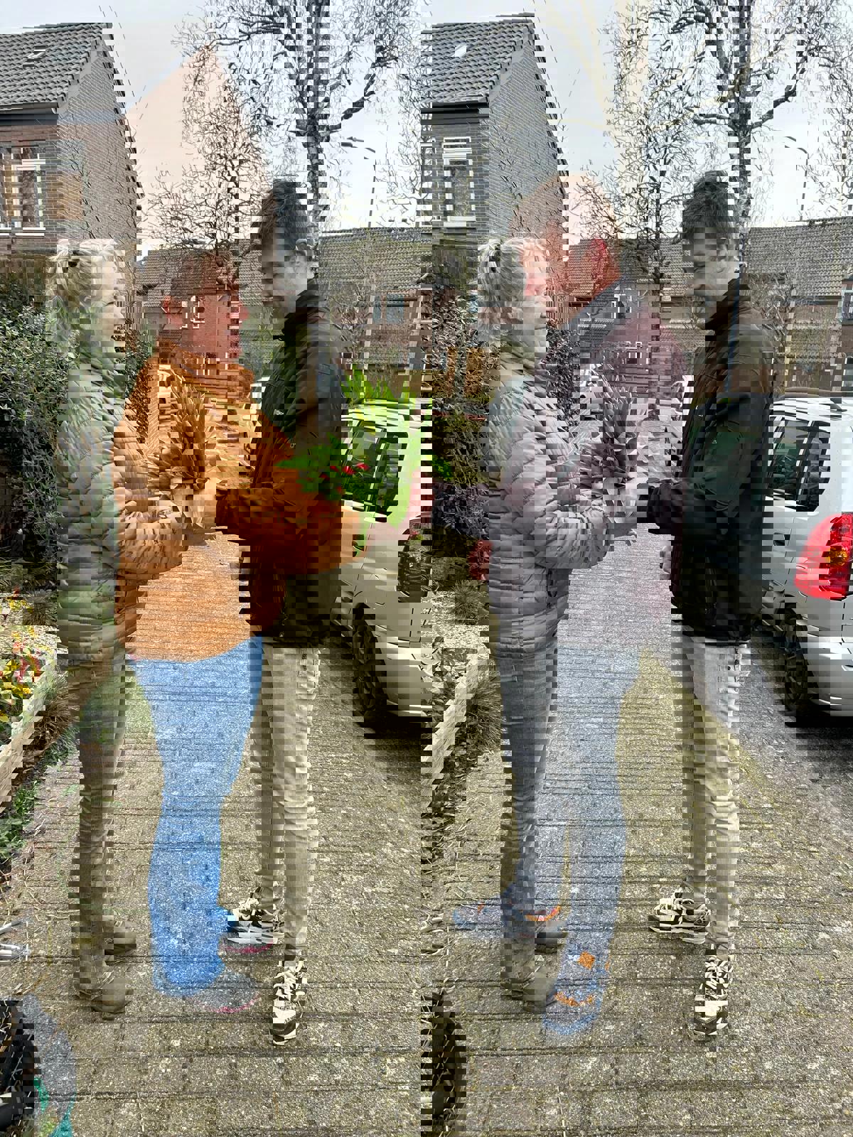 Wijkconsulent Roy rijdt door de Grote Waal heen op zoek naar bewoners die een bosje tulpen verdienen. “Deze tuin ziet er netjes uit en de bewoonster is toevallig bezig met snoeien. Laten we hier stoppen.” De bewoonster is erg verrast. “Wat leuk dat jullie dit doen. Dit maakt m’n dag!”.