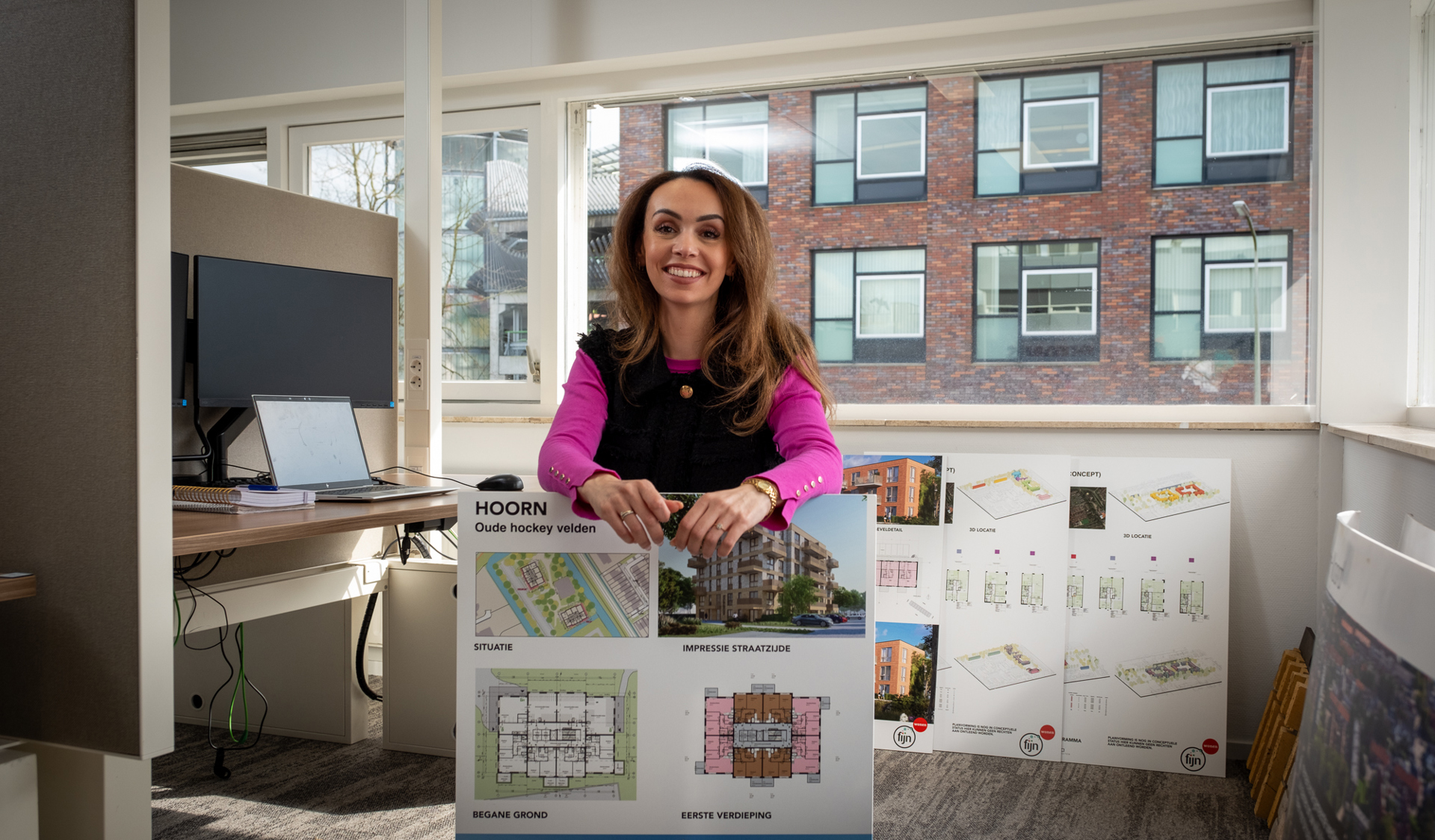 Haar werkplek is omringd door moodboards, kleurstalen en materiaalmonsters. “Hiermee maken we samen met bewoners keuzes voor nieuwbouw”, vertelt Ekram. “Vroeger dacht ik wel eens bij een gebouw: hoe kon iemand dat zó ontwerpen? Nu snap ik het. Of ik doe het anders, haha!”